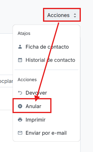 Hemos añadido una nueva acción Anular factura dentro de la ficha de la factura, accesible desde el botón “Acciones” (parte superior derecha).