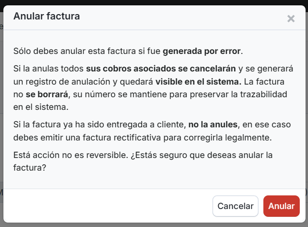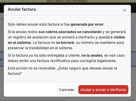 Si tienes VeriFactu activo, también podrás anular facturas siguiendo el mismo proceso. La anulación también quedará registrada en VeriFactu
