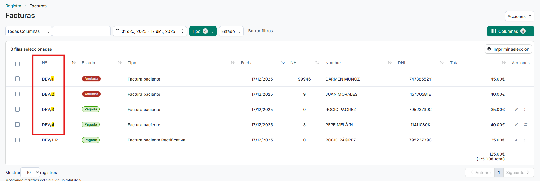 - Anular → factura creada por error, sin operación real y que no ha sido entregada al paciente.