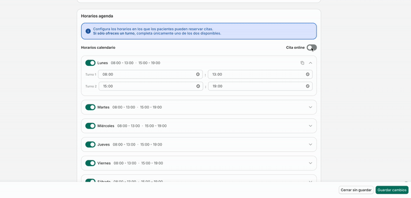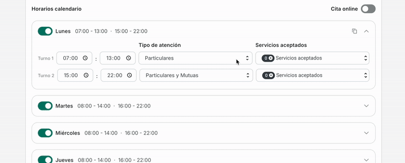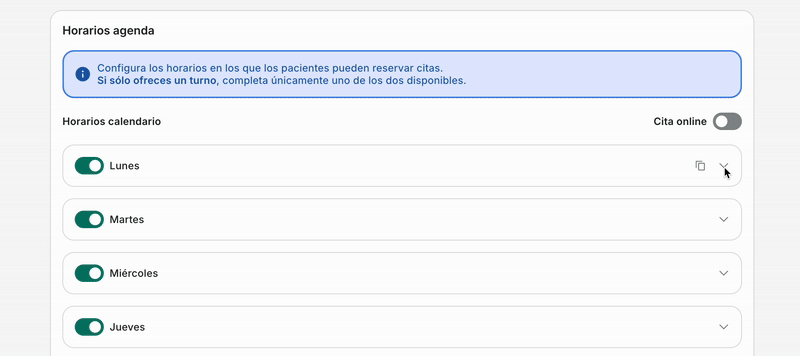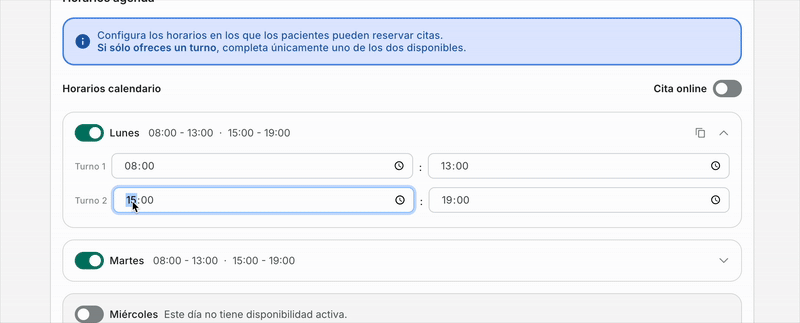 Para configurar los horarios de la cita online, una vez hayas rellenado los horarios que se mostrarán en la agenda, estos se copiarán automáticamente con los mismos valores. Aun así, puedes modificarlos en cualquier momento si lo necesitas. El funcionamiento es el mismo que en la sección de horarios generales.