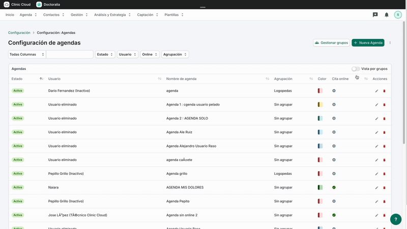 Al activarlo, podrás visualizar las agendas organizadas según los grupos que hayas creado; al desactivarlo, volverás a la vista clásica, donde se muestran todas las agendas de forma individual.