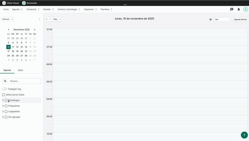 Ahora podrás crear grupos personalizados con las agendas existentes —por profesional, especialidad, centro o cualquier otro criterio— para visualizar solo aquellas que realmente necesites en cada momento. De esta forma, podrás organizar tu calendario de forma más eficiente, alternar entre grupos con un solo clic y reducir la sobrecarga visual cuando trabajas con múltiples agendas a la vez.