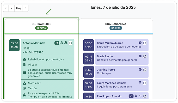 Si sitúas el ratón sobre una cita, podrás ver información adicional como si el paciente tiene mutua, la sala asignada, alertas útiles, el tiempo que lleva en la sala de espera y otros detalles relevantes.