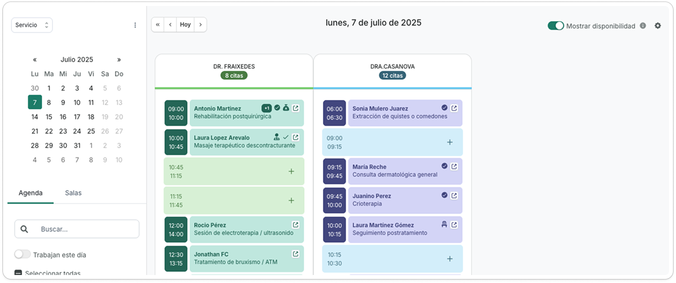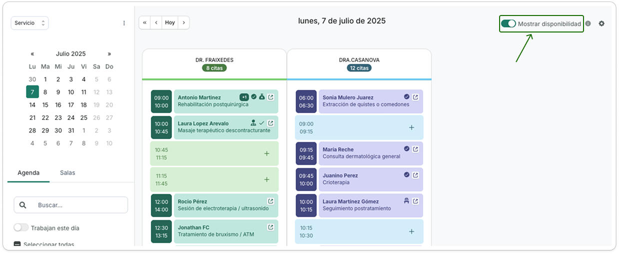 Además, con el interruptor “Ver disponibilidad” puedes mostrar los horarios libres o volver a ocultarlos cuando lo necesites, adaptando la vista a tu forma de trabajar.