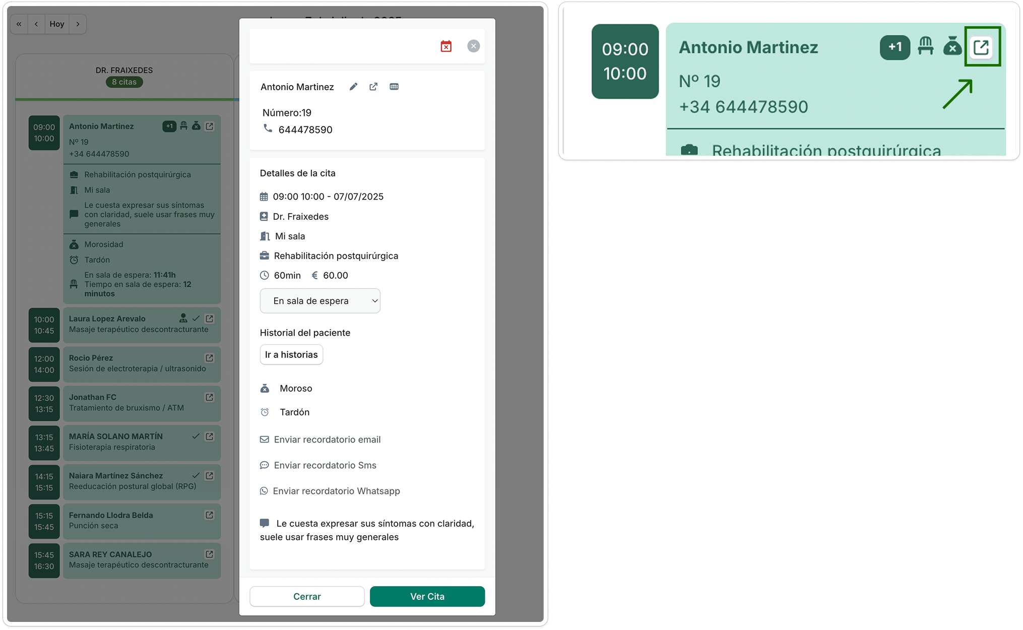 Como hasta ahora, puedes hacer clic sobre la cita para abrir su ventana de detalles y gestionar la información del paciente, y usar el botón del extremo derecho para acceder a la central de historias clínicas.